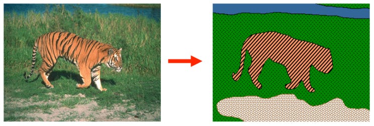 Let's say you are segmenting the image into four classes - tiger (1), ground (2), grass (3), and water (4). Mathematically, every pixel (i,j) in the image is assigned a label one of {1,2,3,4}. So segmentation is a function from the set of pixels of an image M to {1,2,3,4}. If the image dimension is height (H) x width (W), then we want to learn the function f() from the HW dimensional Euclidean space to {1,2,3,4}. In this tutorial, we will learn the function using a convolutional neural network called UNet. Then, a loss function will be used to find the difference between the predicted and actual labels for all the pixels over an image. That loss function will be minimized in a step-by-step optimization algorithm. We will pick a small but important part of the entire process in this tutorial.